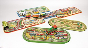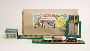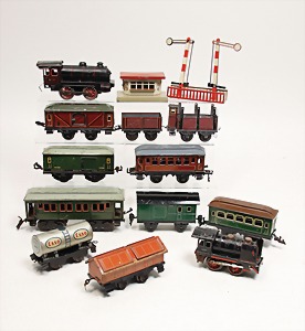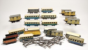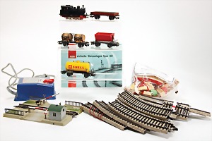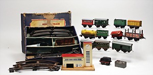 Konv. Eisenbahn, u.a. Hornby Train, nur Gleismaterial, Spur 0, im Orig.-Kart., Kart stark zerschlissen, dazu 1 Blechbahnhof, gem. Cabo, Länge 22 cm, 10 Wagons, Spur 0, versch. Hersteller, darunter Bub, CW, u. Gleismaterial