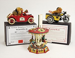 3 Teile Blechspielzeug, neu, 2x Vontura u. Walter, Feuerwehr u. Motorradfahrer, jeweils mit Teddy, 1x Blechkarussell, von Paya