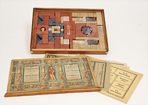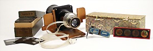 Bild- Betrachter, Blech, elektrisch auf Holzplatte montiert, mit reichhaltigem Zubehör an Bildplatten, Glas, kleiner Bildbetrachter, Blech, Aufschrift: Fullmina