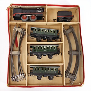 Zugpackung, Spur 0, Schlepptenderlok mit Tender, 3 Wagons und Gleis Material, Orig.-Kart., Karton etwas verschlissen