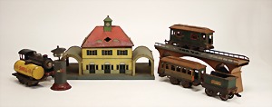 Konv. Eisenbahnteile, Bahnhof H.B.N., 35 x 21 cm, etwas verformt, 1 kl. Teil fehlt, dazu 1 Lok mit Tender Spur 1, 3 Wagons, einige Gleisteile, Bahnübergang, ein Brückenteil, altersbedingte Roststellen, 1 Läutewerk, alles stärker bespielt (Ersatzteilspender)