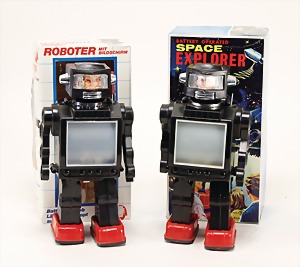 2 Teile, Space Explorer, Batterieoperated, Japan, Kunststoff, 27 cm, 1 Roboter Dickie, neuer, sehr guter Zust., im Orig.-Kart., technisch nicht geprüft