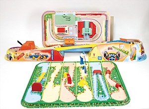 3 Teile, Cola Septury 340, Batterieoperated, Kunststoff, Minigolf 332, Hell Driver, Rodeo 351, alles sehr guter Zust., im Orig.-Kart., Kart. altersbed. stärker verschlissen