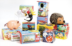 Konv. Köhler, Schwein, 2 Teile, 1 Katze, 2 Vögel, Kunststoff, neuwetig, Orig.-Kart., 1 Krokodil, Happy Crocodile, Blech, lithogr., Uhrwerk Japan, Lehmann Igel 936, Lehmann Eva, Marienkäfer 921, LBZ Spardose, Blech, lithogr., 1 Spieldose, Blech, neuer, alles neuwertig, im Orig.-Kart.
