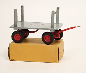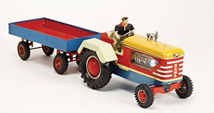 Traktor mit Anhänger, Batterieantrieb, Blech, lithografiert, mit Fahrerfigur, bis auf min. Kratzer, sowie kl. Stellen Flugrost auf der Ladefläche des Anhängers, guter Zust.
