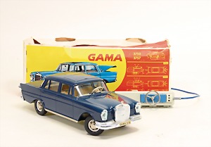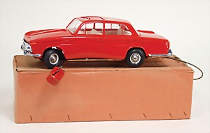 3757 Mercedes, Heckflosse, Blech u. Kunststoffteile, 32 cm, Kabelsteuerung, neuwertig, Orig.-Kart., Einrissstellen am Kart.