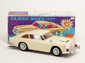 Elektrik, 2 Fahrzeuge Kunststoff, 24,5 cm, bespielt, nicht ganz kompl., 1 James Bond Auto, ohne Fahrerfigur, Aston Martin, guter Zust., Rennwagen, Ferrari, Friktionsantrieb, 20 cm, Made in Germany, Rahmen altersbed. verzogen