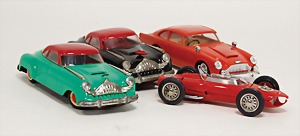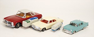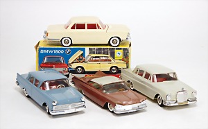 Opel Heckflosse, Uhrwerkantrieb intakt, Mercedes Heckflosse, Uhrwerkantrieb, bespiel, gut, amerik. Limousine Heckflosse, stark bespielt, Dach gebrochen, Friktionsantrieb, BMW 1800, Uhrwerkantrieb, 470, sehr guter Zust., im Orig.-Kart.