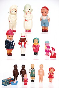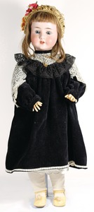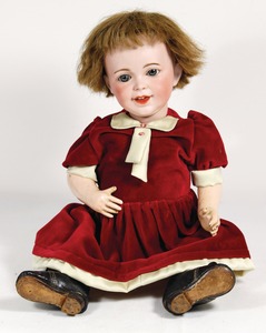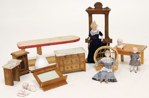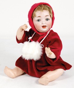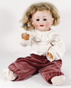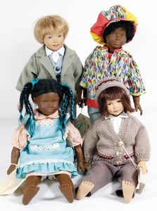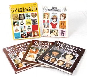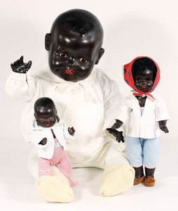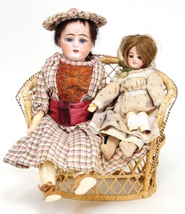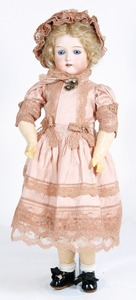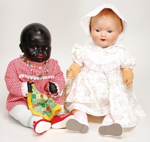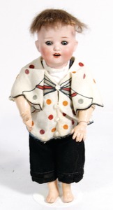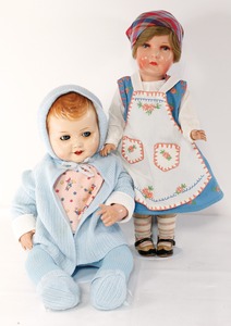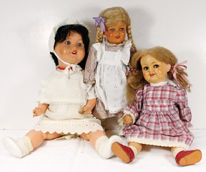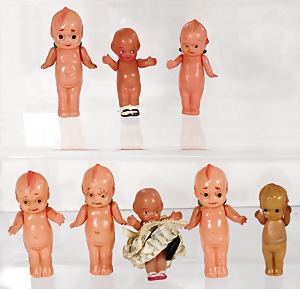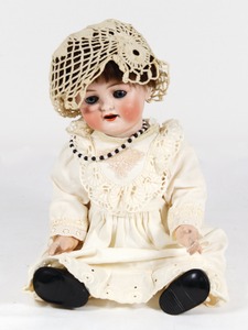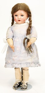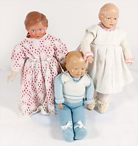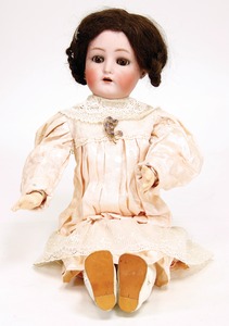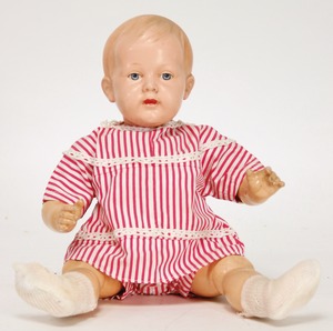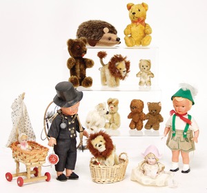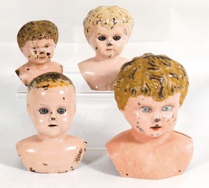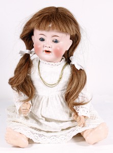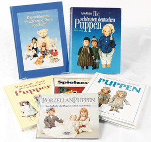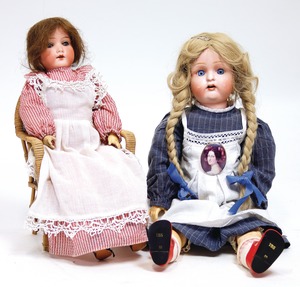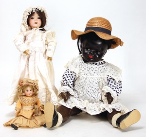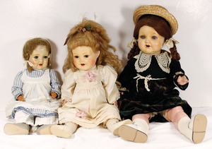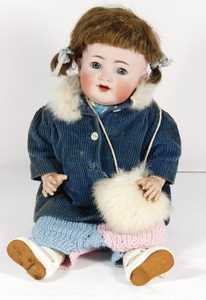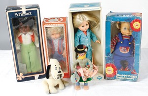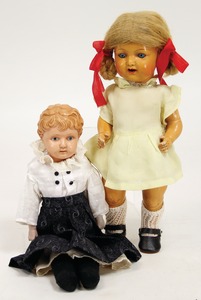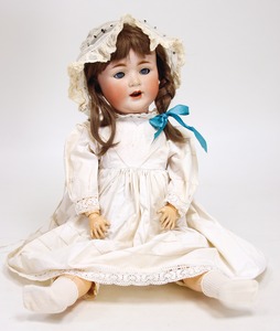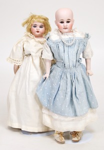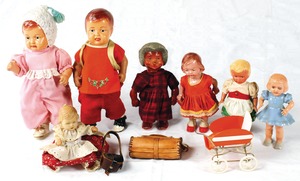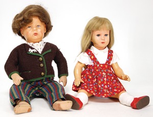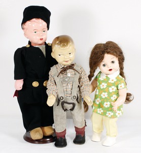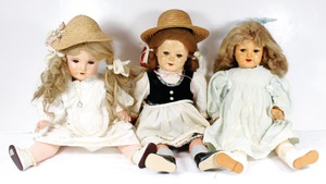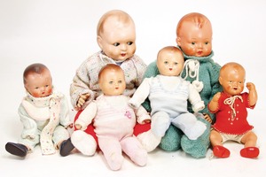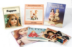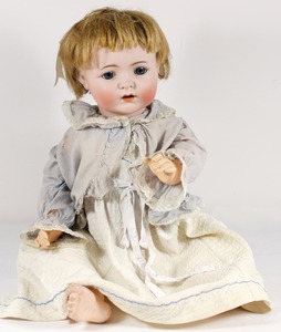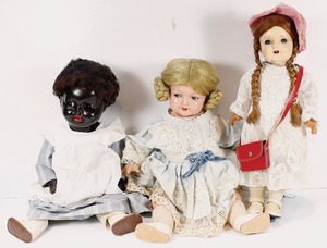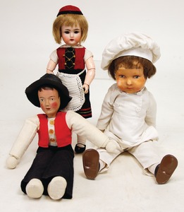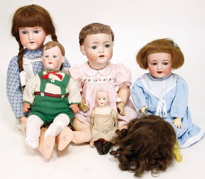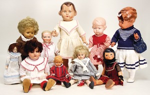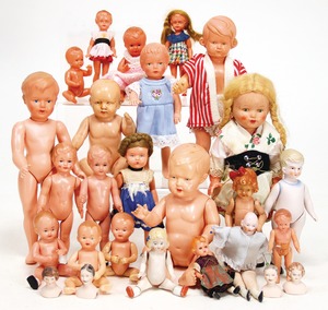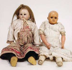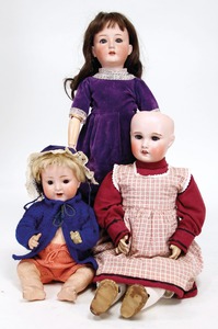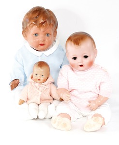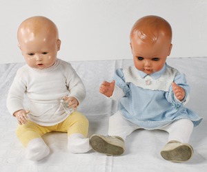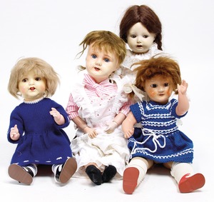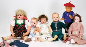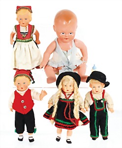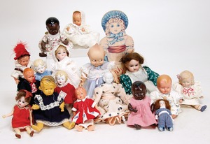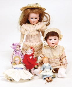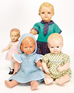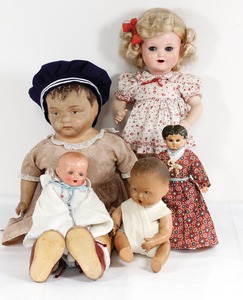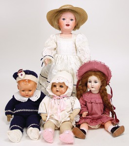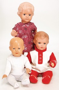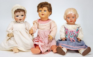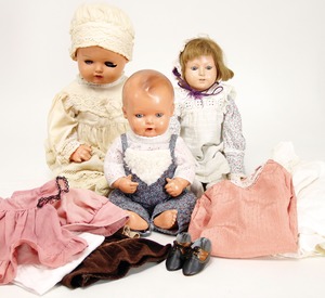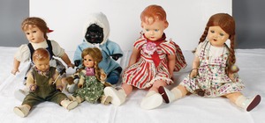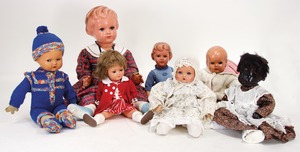 Konv. Masse, AM 520, Einbindekopf-Baby, 22 cm, blaue Schlafaugen, K&W 155/7, blaue Schelmenaugen, off. Mund, oben Zähne, Masse-Stehkörper, alte Kleidung, Kunsthaarperücke, Masse-Brustblattkopf-Puppe, gemalte Augen, Stoffkörper, Masse-Arme u. -Beine, 50 cm, durch Ziehen von Schnüren am Rücken bewegen sich die Beine, Spannungsrisse auf der Stirn sowie am Hinterkopf, Einbindekopf-Massebaby, Kunsthaarperücke, 1 Brustblattkopf-Puppe, 50 cm, Beine bewegl. durch Faden am Rücken, 1 Blech-Brustblattkopf-Puppe, Glasaugen Stoffkörper, Kunststoff-Hände, 25 cm, 1 Gummipuppe, altersbed. starke Rissbildung, Arm u. Bein getaped