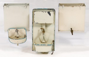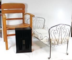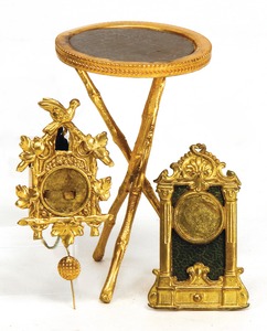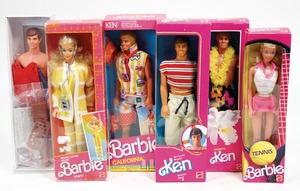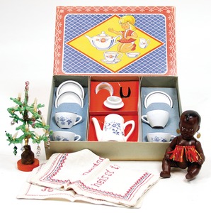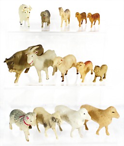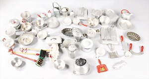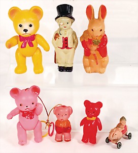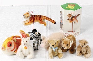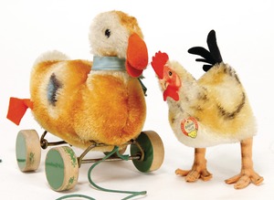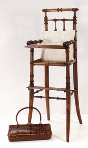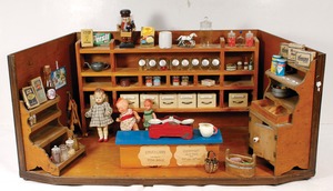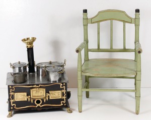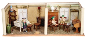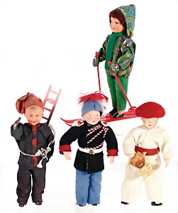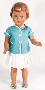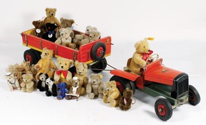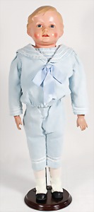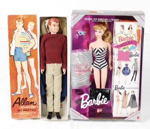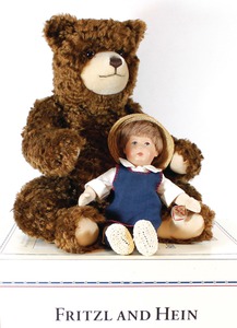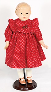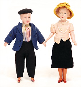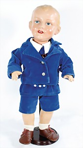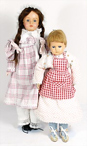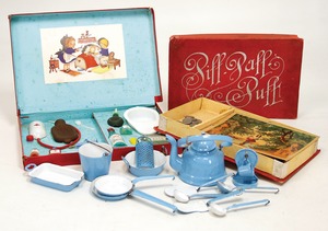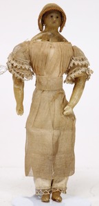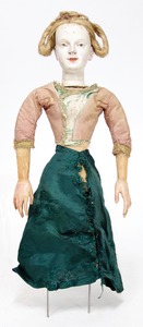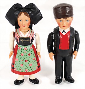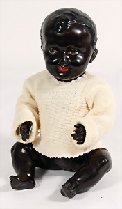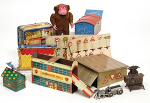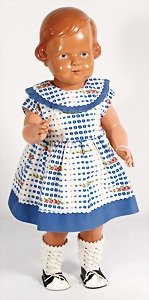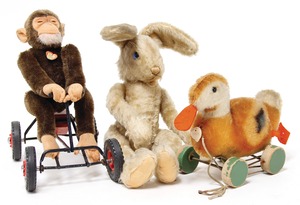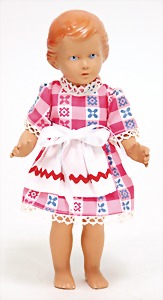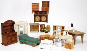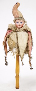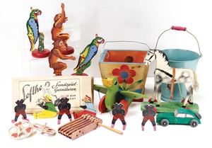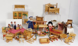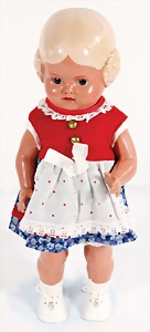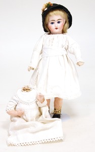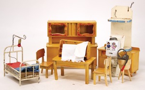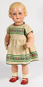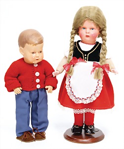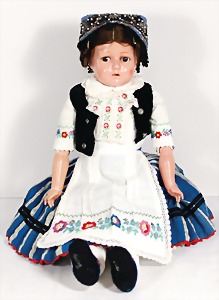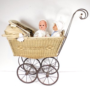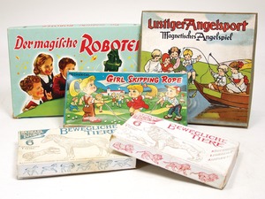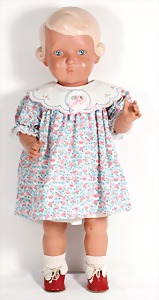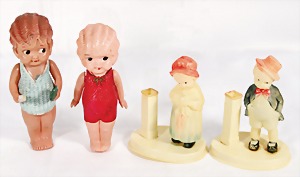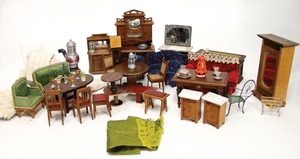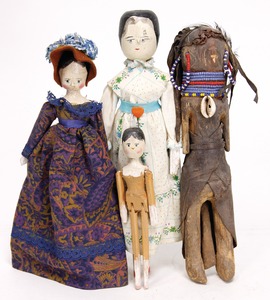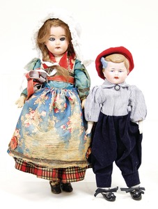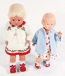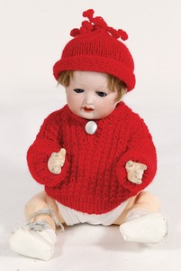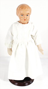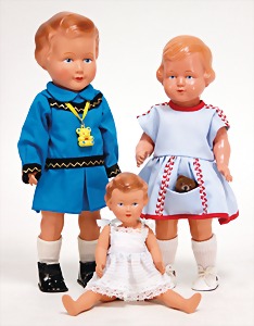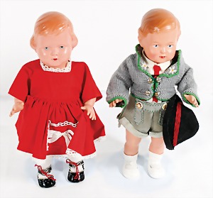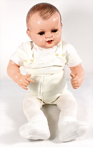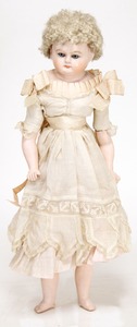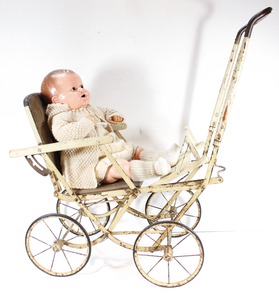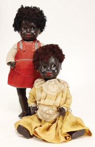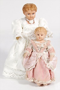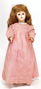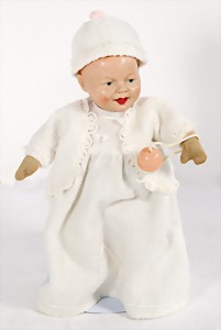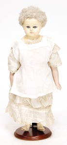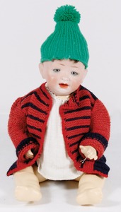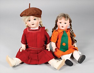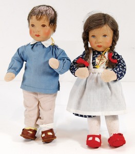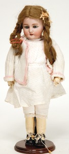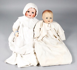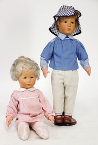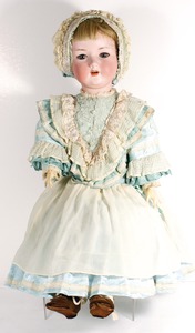 Konv. Masse, AM 520, Einbindekopf-Baby, 22 cm, blaue Schlafaugen, K&W 155/7, blaue Schelmenaugen, off. Mund, oben Zähne, Masse-Stehkörper, alte Kleidung, Kunsthaarperücke, Masse-Brustblattkopf-Puppe, gemalte Augen, Stoffkörper, Masse-Arme u. -Beine, 50 cm, durch Ziehen von Schnüren am Rücken bewegen sich die Beine, Spannungsrisse auf der Stirn sowie am Hinterkopf, Einbindekopf-Massebaby, Kunsthaarperücke, 1 Brustblattkopf-Puppe, 50 cm, Beine bewegl. durch Faden am Rücken, 1 Blech-Brustblattkopf-Puppe, Glasaugen Stoffkörper, Kunststoff-Hände, 25 cm, 1 Gummipuppe, altersbed. starke Rissbildung, Arm u. Bein getaped