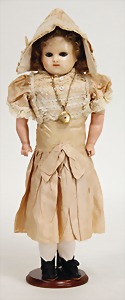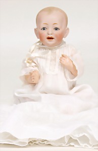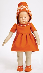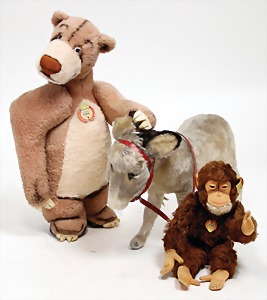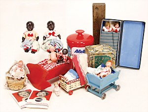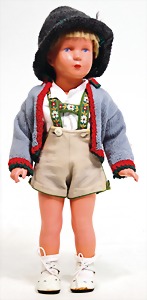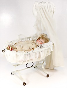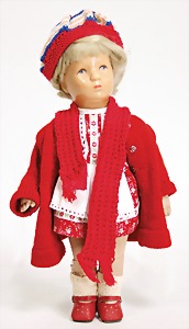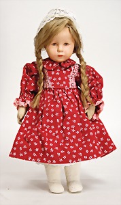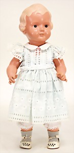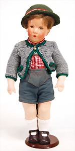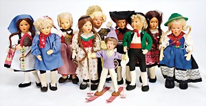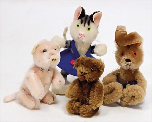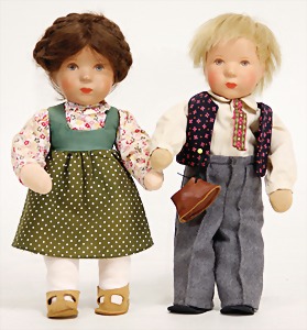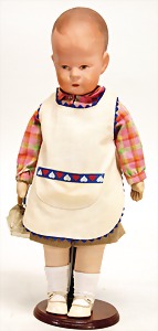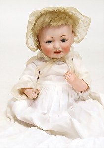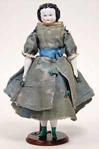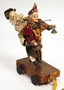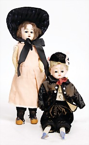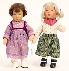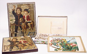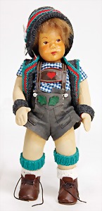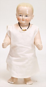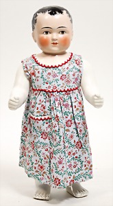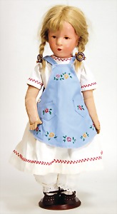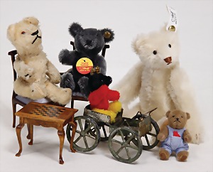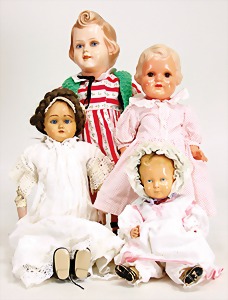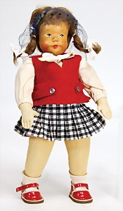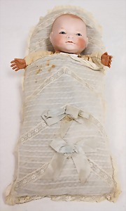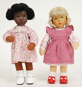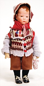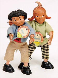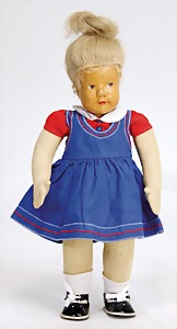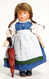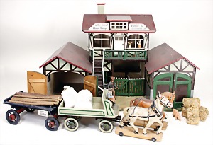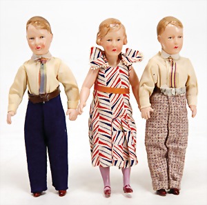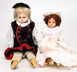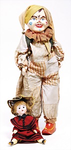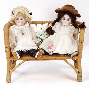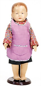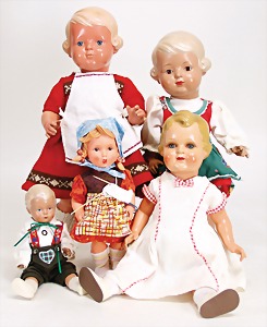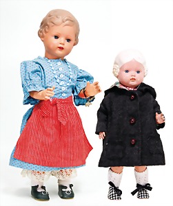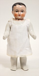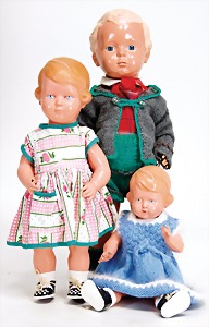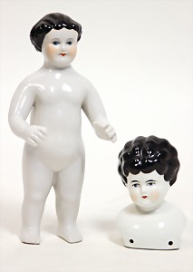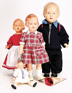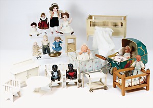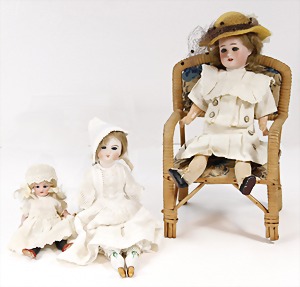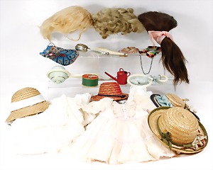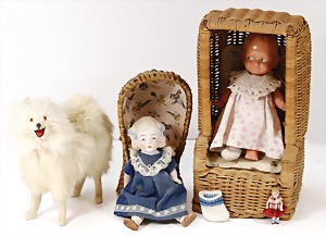 3 Puppen, Papiermaché u. Masse, 1 x dunkel gespritzt, ungem., braune Schelmenaugen, 43 cm, 1 x Brustblatt, blaue fest eingesetzte Glasaugen, geschl. Mund, Echthaarperücke, Wachstuchkörper, Masse-Hände, 40 cm, 1 x Papiermaché, Junge, Stoffkörper, Holzwolle gestopft, 32 cm, 1 Puppenbüste, Masse, 13 cm, 1 Pferd, Holz, auf Rädern, Länge 31 cm