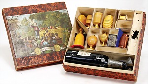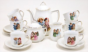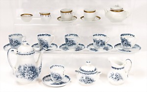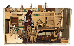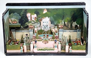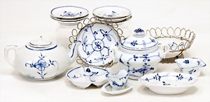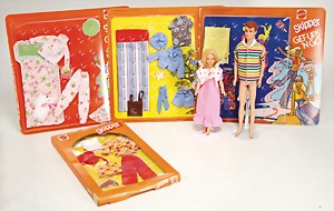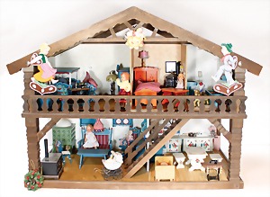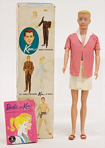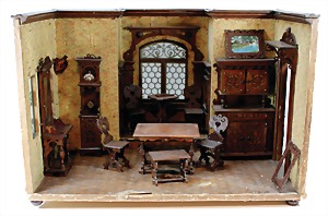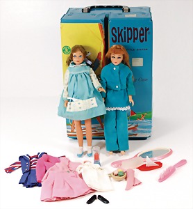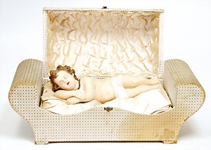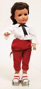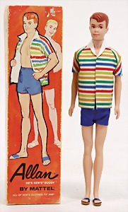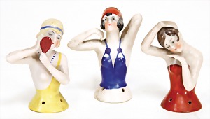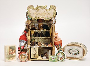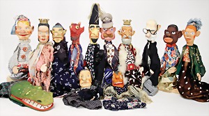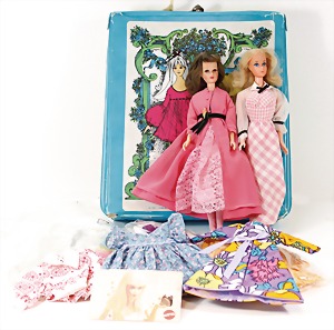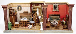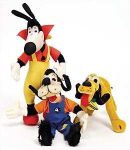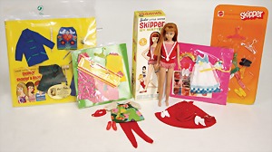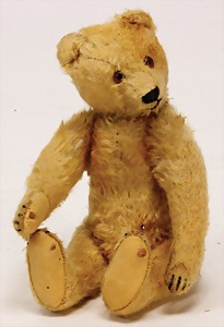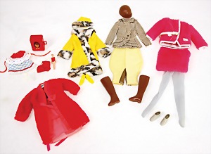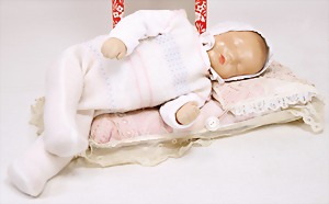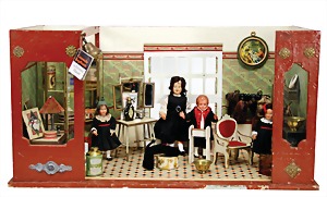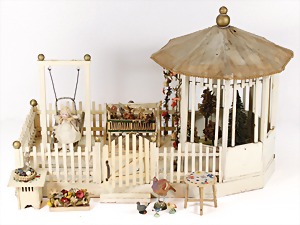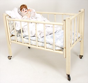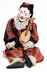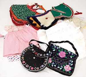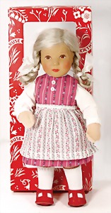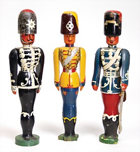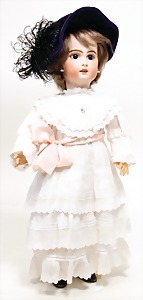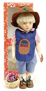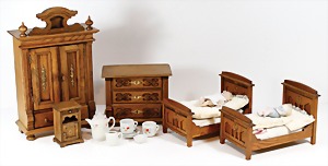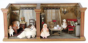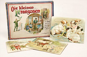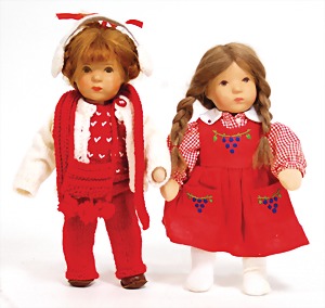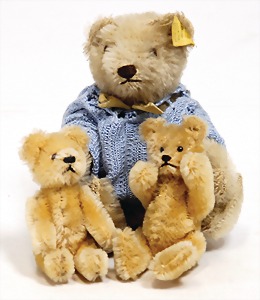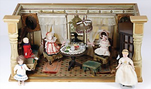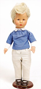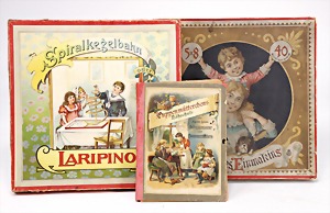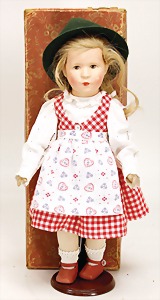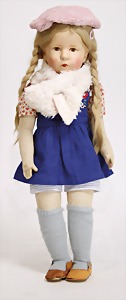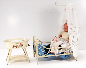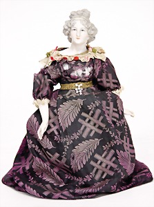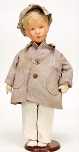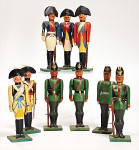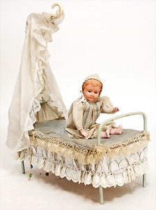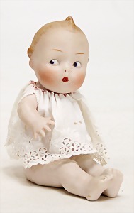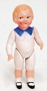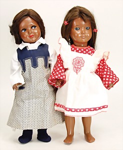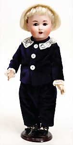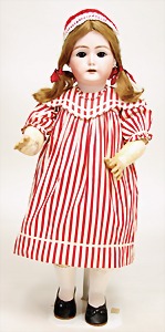 3 Puppen, Papiermaché u. Masse, 1 x dunkel gespritzt, ungem., braune Schelmenaugen, 43 cm, 1 x Brustblatt, blaue fest eingesetzte Glasaugen, geschl. Mund, Echthaarperücke, Wachstuchkörper, Masse-Hände, 40 cm, 1 x Papiermaché, Junge, Stoffkörper, Holzwolle gestopft, 32 cm, 1 Puppenbüste, Masse, 13 cm, 1 Pferd, Holz, auf Rädern, Länge 31 cm