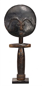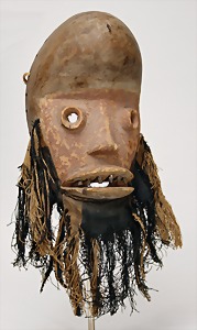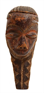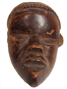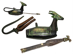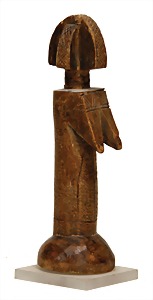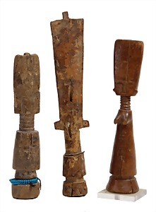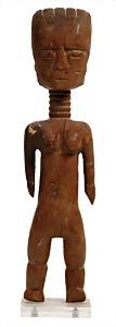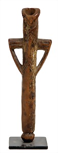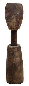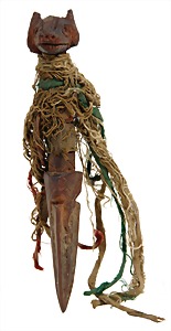 Holzfigur, geschnitzt, Tierkopf, unten Pfeilspitze auf Holz, in der Mitte mit Stoffresten umwickelt, ca. 22 cm