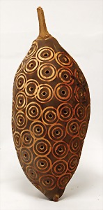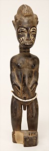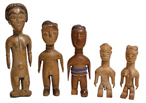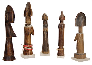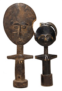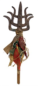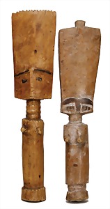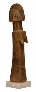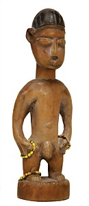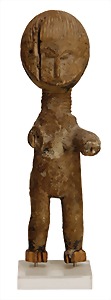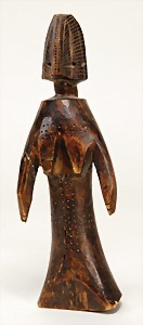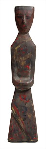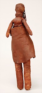 2 Teile, 1 Tonfigur, mit Stoff umwickelt, 1 kl. Hut, mit Perlen bestickt, mit Stoff, Leder u. Holz, 16 – 22 cm
