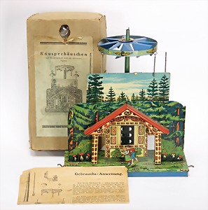 Weihnachtsgeläut, Knusperhäuchen, mit Glockengeläute und sich drehenden Figuren, Blech lithogr., im Orig.-Kart., mit Anleitung, guter Zust., ausgefallen, selten in dieser Ausführung