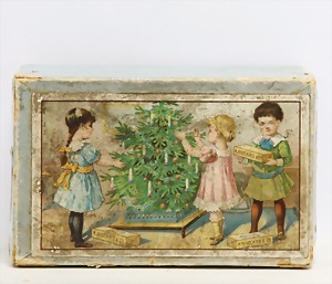 Schachtel mit Weihnachtsmotiv, 11 x 6,5 cm, um 1900, schönes bunt lithogr. Deckbild, ein wenig verschmutzt