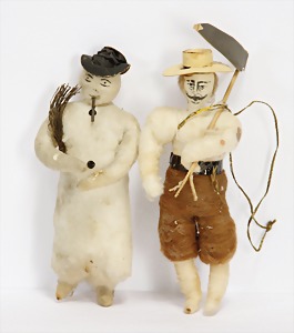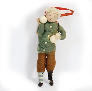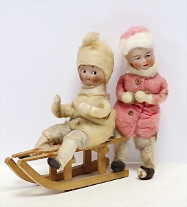 Christbaumschmuck, Heubach, spielende Schneekinder, Biskuitkopf, Körper Watte, 9,5 cm u. 8,5 cm