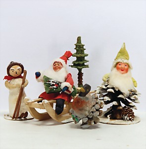 3 Teile, Christbaumschmuck, Weihnachtsmann auf Schlitten, mit Kreppkleidung, Schneemann, Watte, Zwerg auf Zapfen, Zapfen mit Entenkopf