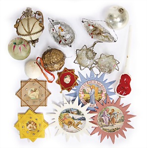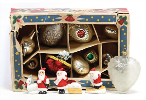 Christbaumschmuck, kl. Kugeln, Stern, Flasche, Glocke, Herz, Spiegelglas, dazu 1 Kugel Metall, Guss, Engelsmotiv, 1 Herz, Milchglas, Farbe abgerieben, 3 kl. Porzellan-Weihnachtsmänner