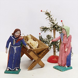 Holz geschnitzt, Maria u. Joseph, dazu 1 Krippe, mit Wachs-Jesuskind, 1 Tannenbaum, 10 cm