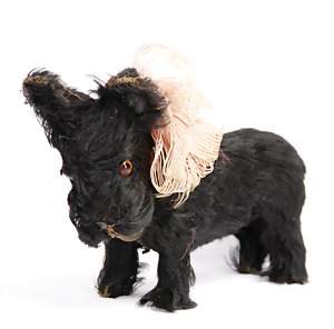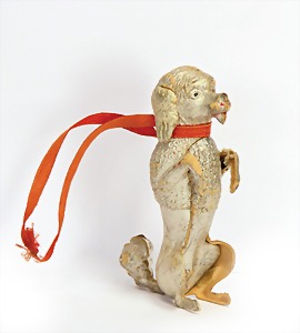 Struppi, Candycontainer, Papiermaché, Mohair, Glasaugen, mit Messing-Schild „Ich heiße Strupp und bin von Suchard“, 50er Jahre, 20 cm