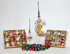 Konv. Christbaumschmuck, Glas, wohl 50er Jahre, gr. Spitze, 36 cm, Orig.-verpackt, ca. 4 m Kette, einige Kugeln, 1 Spitze später