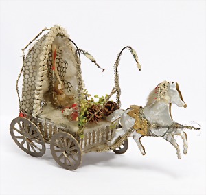 Sebnitz-Kutsche, leonische Drähte, Pferd, Dresdner Pappe, Wachskind, Obladenbild, 12 cm, ausgefallen