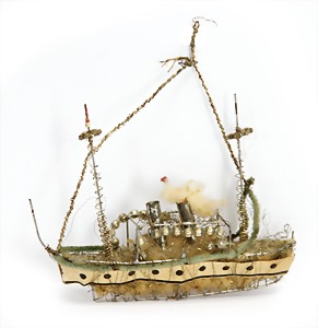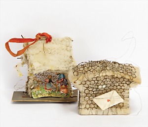 Christbaumschmuck, 2 Teile Sebnitz, Briefkasten mit Liebesbrief, 7 cm, leonische Drähte, Watte, Papier, dazu ein Hexenhäuschen, 6 cm, leonische Drähte, Watte, Boden Pappe