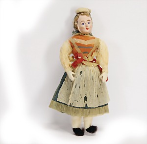 Christbaumschmuck, Watte, Mädchen, Mohair-Frisur, Kreppkleidung, altersbed. etwas abgegriffen, Masse-Gesicht, 12,5 cm