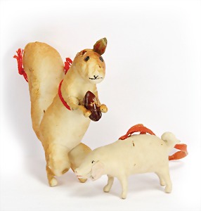 Christbaumschmuck, Watte 2 Teile, Eichhörnchen mit Nuss, 9 cm, 1 Ohr fehlt, 1 Ohr möglicherw. ergänzt, dazu 1 Glücksschwein, 7 cm