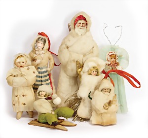 Christbaumschmuck, Watte, Weihnachtsmann mit Obladen-Gesicht, Kinder auf Schlitten, 7 - 8 cm, ein Obladenbild mit Krepppapier, meist guter Zust., teils kl. Fehler