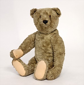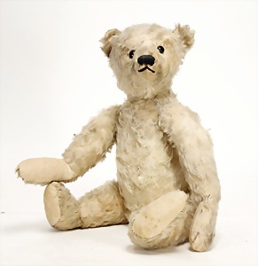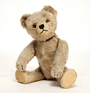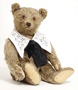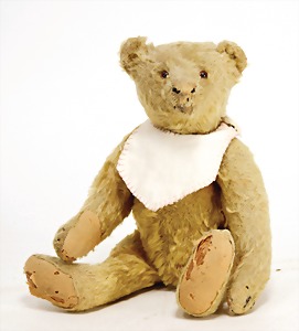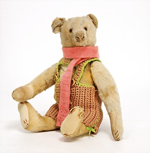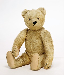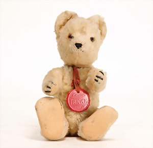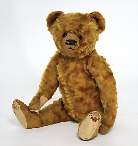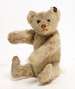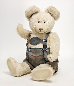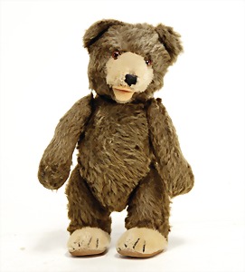 Bär, Kriegsproduktion, Wollplüsch, 45 cm, lange abgeknickt Arme, leichter Buckel, mit Knopf und Fahne, Nr. unleserlich, Filztatzen bis auf kl. Stellen gut, Stimme intakt, Wollplüsch etwas verschmutzt, Dachbodenfund