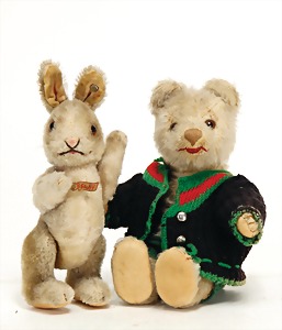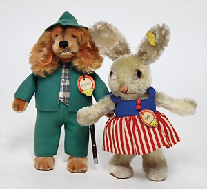 Konv., Schuco Biego Bello, Bär mit Stimme, mit Schild, Kopf nachtr. befestigt, Schuco Panda Bär, mit Stimme, 1 Schuco Bär Biego Bello gelb, mit Schild, guter Zust., 2 kl. Bären Karl, Kunststoff, 1 Steiff Foxy, kompl., Nr. unleserlich, 1 Trachtenpuppe, Kunststoff