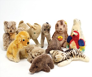 14 Teile, meist ohne Knopf u. Schild, darunter, Renni, kompl., Nr. 1314.00, Ente, komplett, Nr. 2311.07, Hahn Ente, Fisch, kl. Elefant, Dromedar, Steinbock, Kuh, etc., bespielt bis gut