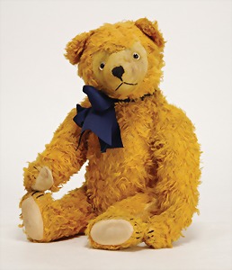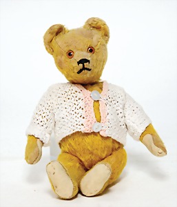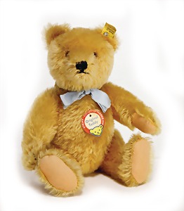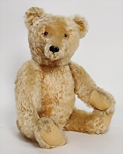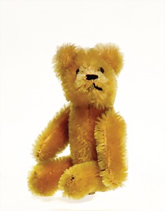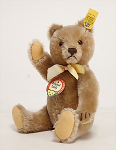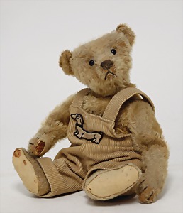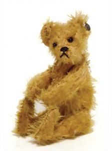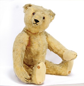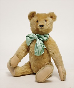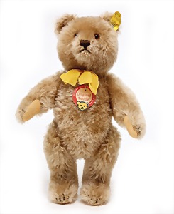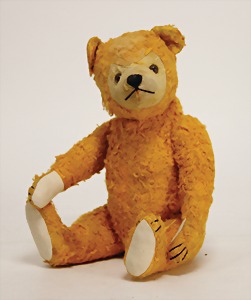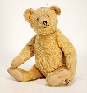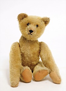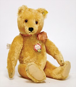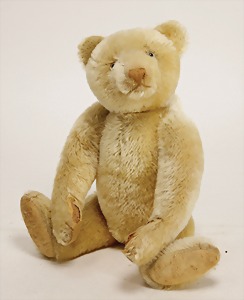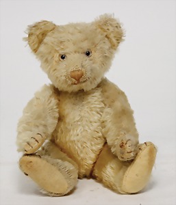 Bär, Vorkrieg, gelb, 42 cm, mit Knopf, lang gezogenes F, Reste gelber Fahne, lange abgeknickte Arme, leichter Buckel, Stimme defekt, Mohairverlust um die Schnauze, Bestickung teilw. abgerieben, Tatzen bis auf minim. Stellen gut