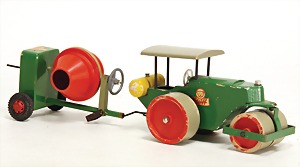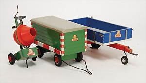 Betonmischmaschine, bespielt, Bauwagen, Holz, mit einigen Zubehörteilen, leicht bespielt, gut, 1 Anhänger, leicht bespielt, gut