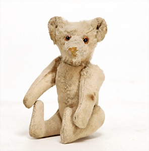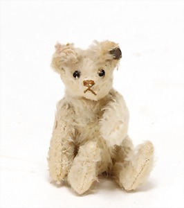 Bär, 34 cm, früh, Schuhknopfaugen, lange abgeknickt Arme, Buckel, helle Bestickung, weißes Mohair, stark abgeliebt, etwas vergilbt, ohne Knopf, Tatzen übernäht