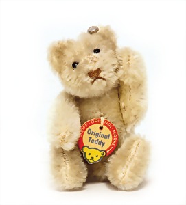Orig.-Teddy, grau, 25 cm, kompl., Knopf, Schild, Fahne, u. U.S. Fahne, Nr. 5325,2, sehr guter Zust.