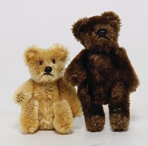 2 Teile Bären, 50er Jahre, 9 cm, gelb und dunkelbraun, ohne Knopf und Schild, leicht bespielt - gut