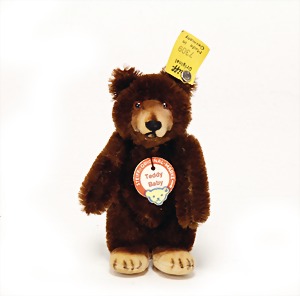 Teddy-Baby, dunkelbraun, 9 cm, kompl., Nr. 7309, Schild mit roter Schrift, mit U.S. Fahne, sehr guter Zust.