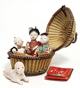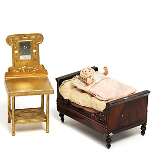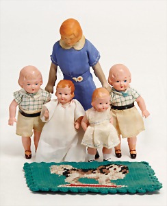 Konv. Puppenstuben-Puppen, Masse u. Celluloid, 30er Jahre, Dame, 13,5 cm, Kinder, Kissen