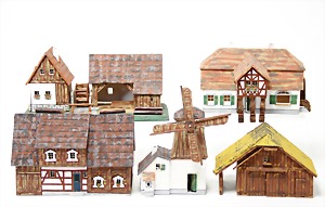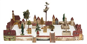Dorf, Holz, farbig gefasst, Gebäude, 8 – 12 cm, Brunnen, Mauerteile, Bäume