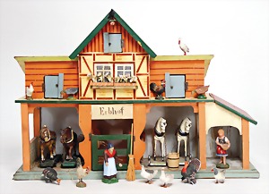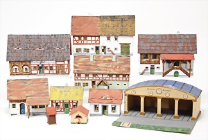 Häuser, Holz, aufwendig handlackiert, 8 Teile, Straßen-Bahnhof, Grundplatte 22 x 22 cm, Höhe 10 cm, Bauernhäuser, dazu kl. Toilette, 1 Backofen, unberührter Orig.-Zust., Hersteller: Karl Max Koallick, Dresden