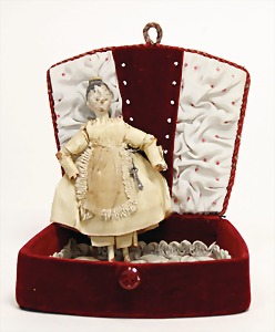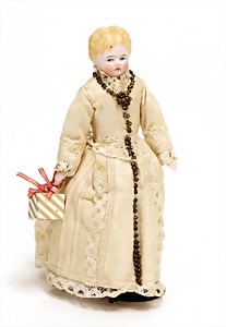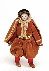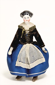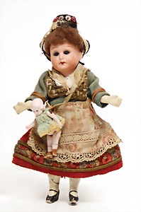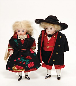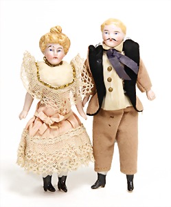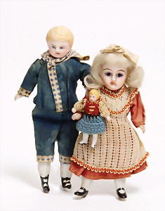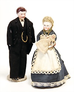 2 kl. Ganzbiskuit-Puppenstuben-Puppen, 9 cm, feste Köpfe, fest eingesetzte Glasaugen, geschl. Mund, bewegl. Arme u. Beine, im Orig.-Kart., beschriftet: Fränkische Tracht, um 1900