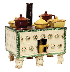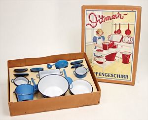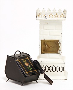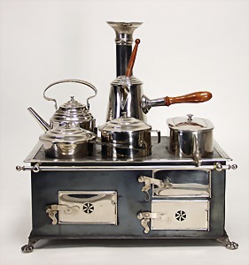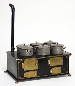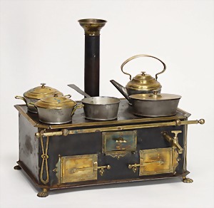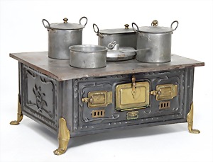 Puppenküchen-Herd, ca. 1895, 33 cm breit, eingebautes Wasserschiff, vorne mit Hahn, Wasserkessel, Topfpfanne, Topf, 1 Topf ohne Deckel, vordere Messingleiste etwas lose, Orig.-Zust., außergew. Form