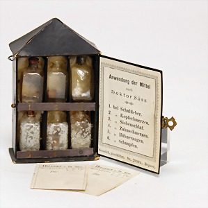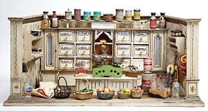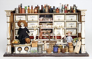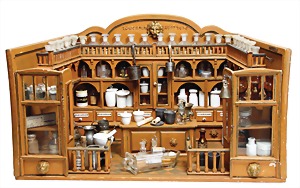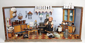 Puppenstuben-Apotheke, 74 cm breit, 37 cm hoch, Regale, Schubladen, mittig Vitrine, seitl. Schaufenster, Orig.-Theke, sehr schön gearbeitet, ca. 1890, reichh. Zubehör