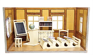 Puppenstubenschule, 54,5 cm breit, 30 c hoch, 35 cm tief, möbliert, sehr schöne Bemalung innen u. außen, 4 Fenster