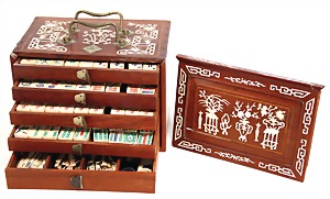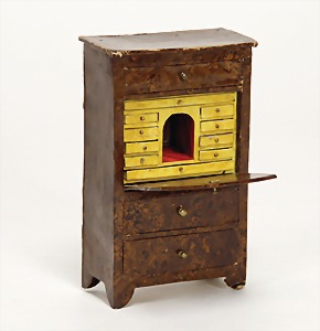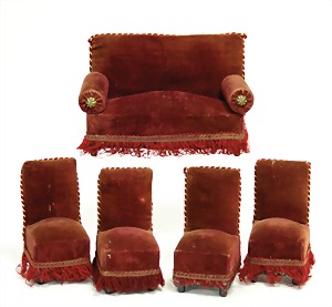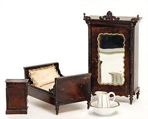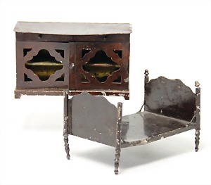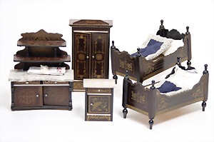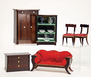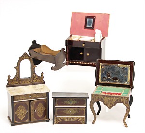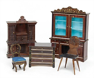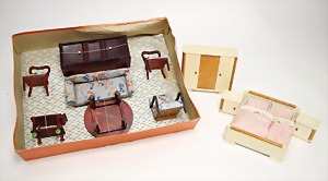 Puppenstuben-Möbel, Wohnzimmer, wohl 30er Jahre, Kommode, 20,5 cm, Sitzgruppe mit Serviertisch, im Orig.-Kart., Kart. altersbed. stark verschlissen, dazu 1 Schlafzimmerprogramm, Höhe Schrank 14,5 cm