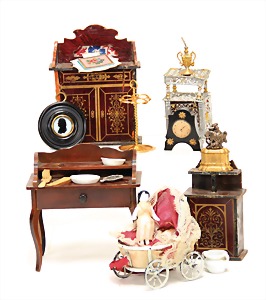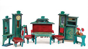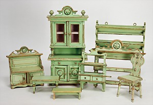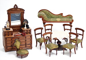 Puppenstuben-Möbelprogramm, Jugendstil, Schrank, Höhe 17,5 cm, Uhr, Höhe 17 cm, Sitzgruppe, Sofa, 4 Stühle, Tisch, 1 Blumenbank, 1 Spiegel, grün, goldenes Dekor