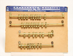 Musterkarte, Messing/Blech vergoldet, Puppenheim-Garnitur No. 413, Rein Messing, 4-tlg., mit Klammern